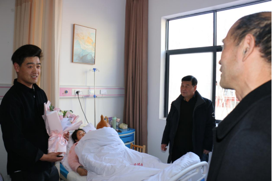 在产房里,高华民一行看望慰问刘强的妻子,并了解刘强及家人工作生活方面有什么需求和困难,为他们送去了住院期间所需的米、面、油、鸡蛋、牛奶等生活用品。